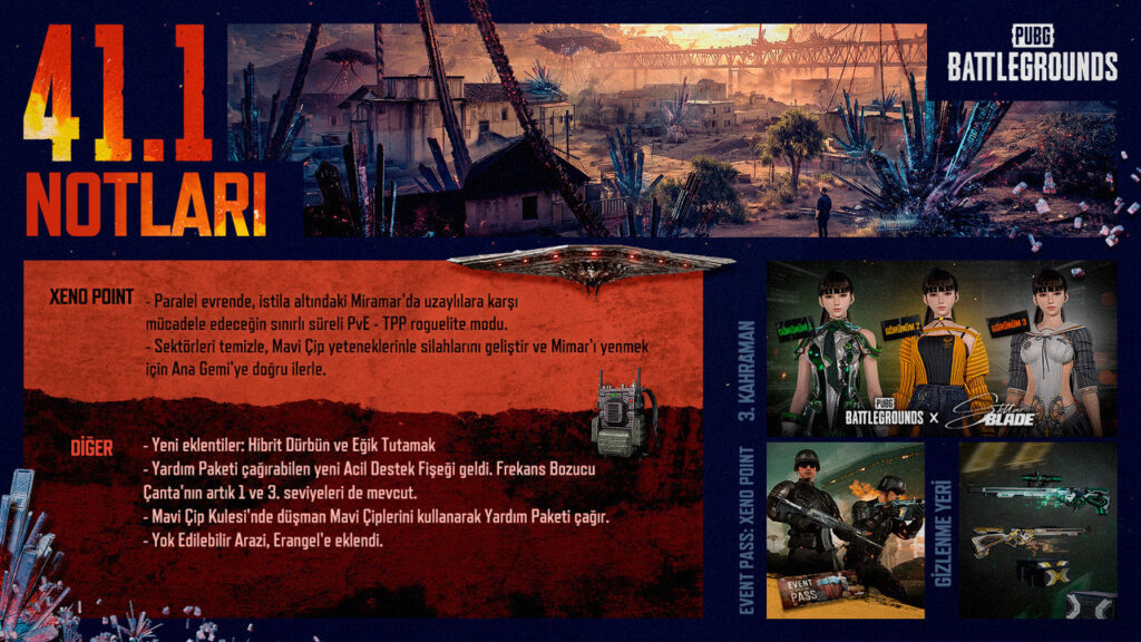 KRAFTON, PUBG: BATTLEGROUNDS için 41.1 güncellemesini duyurdu. Bu güncelleme, Miramar haritasına özel yeni bir PvE modu olan Xeno Point’i barındırıyor. 11 Nisan 2026 tarihinde yayımlanan güncelleme, uzaylı temalı oyun modları, popüler aksiyon oyunu Stellar Blade ile olan iş birliği ve K-pop grubu aespa’nın geri dönüşünü içeriyor.